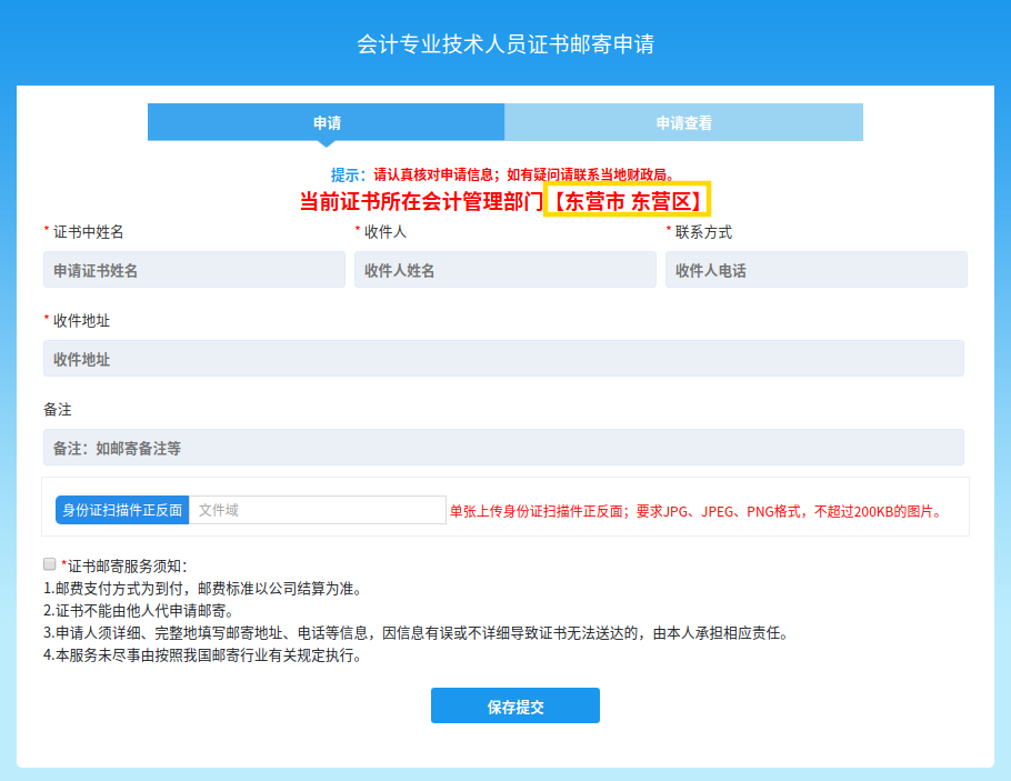 (二)邮寄领取。登陆山东会计信息网“山东会计之家—证书邮寄申请”申请邮寄服务,所需费用为邮政EMS到付。申请人员填写身份证号码等信息后,点击“证书邮寄检测并进入信息填写页”,即可查询证书所在县区(开发区、农高区)。申请人须准确完整填写邮寄地址、联系方式等信息,因信息有误或不详细导致证书无法送达的,由申请人承担相应责任。